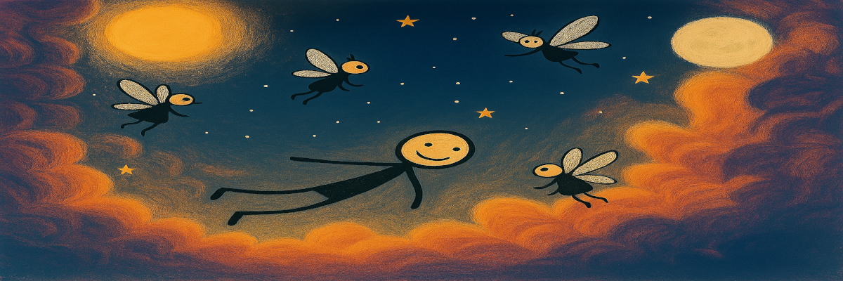 This a child's stick figure dream the sun drums upon the clouds faeries hum with their wings they sing and dance the dream under the moonlight